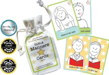 Honored as Dr. Toy’s 10 Best Socially Responsible Products for 2011 and one of Dr. Toy’s 100 Best New Products for Children 2011, Golly Gee-pers Table Manners Cards not only teach kids proper etiquette, the entire process really enhances the mealtime experience –for everyone. Here’s a video: