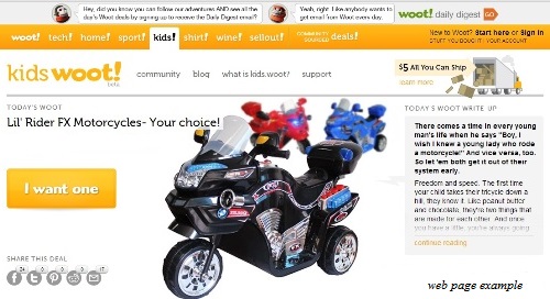 Woot Style. For many parents, just visiting Kids.woot is an entertaining adventure, due in large part to the company’s irreverent, funny writing style. The fan-based social community of woot includes a plethora of venues where folks are encouraged to “discuss,” including Kid Woots, Woots Plus, World of Kids.Woot, Everything But Woot and more. Which could make shopping, well –a lot more fun. Sophomoric? Perhaps. But can you get through one visit without at least one woot (i.e. chuckle)?