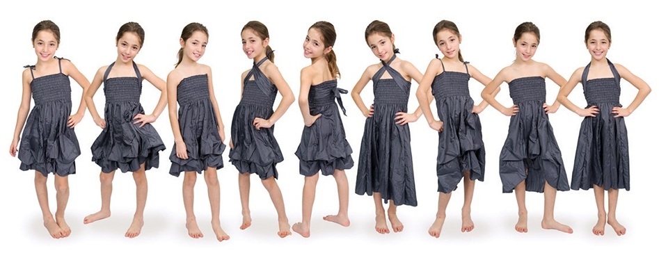 052913_InfinityForGirls_lineupSingular and Infinite. For anyone who is looking for the basics, there’s nothing basic about Infinity For Girls. The company’s signature design is one dress, available in one size that fits girls ages four through 10, that can be worn in a plethora of ways –enough to let young fashionistas flaunt their brave, beautiful style- and never be bored with the outfit.