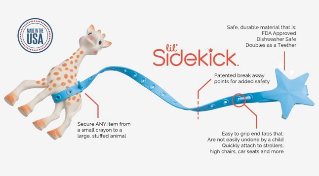 Lil’ Sidekick is not your ordinary tether. It is packed with innovative and useful features such as a built in teether, patented break away points for added safety and is not easily undone by a child. “I designed it to be extremely versatile so it can adjust to secure any item, from a small crayon to a large stuffed animal,” Amy says. Lil’ Sidekick also secures to anything -a stroller, car seat, baby carrier, high chair, grocery cart- unlike limited-use competitors.